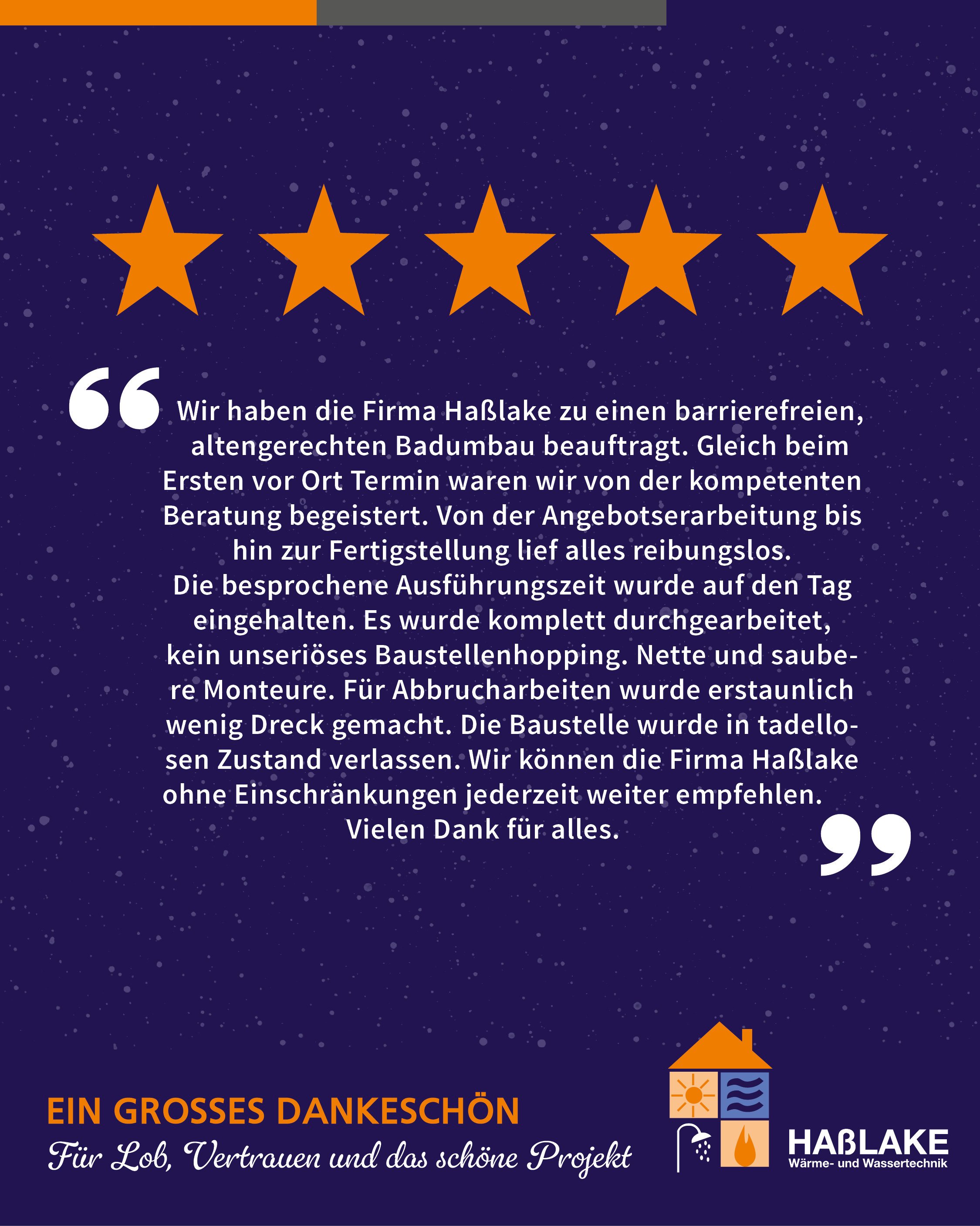 Am Ende durfte Frau Post ein barrierefreies Bad in Empfang nehmen, das bis ins Detail ihren Vorstellungen entsprach. Die Baustelle haben wir in tadellosem Zustand hinterlassen. Ihr positives Feedback freut uns besonders: „Wir können die Firma Haßlake ohne Einschränkungen jederzeit weiterempfehlen.“ Solche Rückmeldungen bestätigen unsere Philosophie: Seit über 20 Jahren stehen wir im Münsterland für Freundlichkeit, Verlässlichkeit und solide technische Lösungen, die wirklich halten, was sie versprechen.